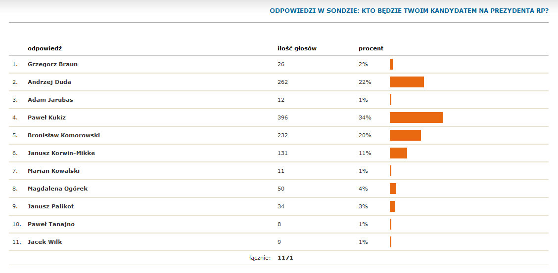 SondÄ™ powtórzyliÅ›my po miesiÄ…cu, ponownie kierowaliÅ›my siÄ™ zasadÄ…: jeden gÅ‚os z jednego adresu IP. ByÅ‚y lider zespoÅ‚u Piersi, radny sejmiku dolnoÅ›lÄ…skiego na finiszu kampanii wyborczej awansowaÅ‚ we wszystkich najpoważniejszych sondażach. Zajmuje w nich jednak trzecie miejsce, za BronisÅ‚awem Komorowskim i Andrzejem DudÄ….