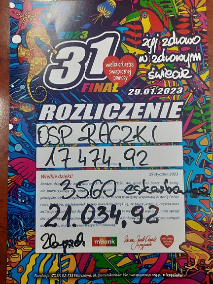 Jak informuje Andrzej Czuper, prezes OSP w Raczkach, zebrano w sumie 21 034,92 zł, w tym 3560 w elektroniczne puszce.