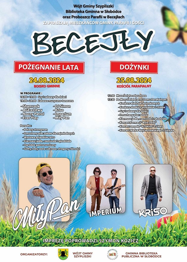 Wójt Gminy Szypliszki, Biblioteka Gminna w Słobódce oraz Parafia w Becejłach serdecznie zapraszają na festyn Pożegnanie Lata oraz dożynki w Becejłach.