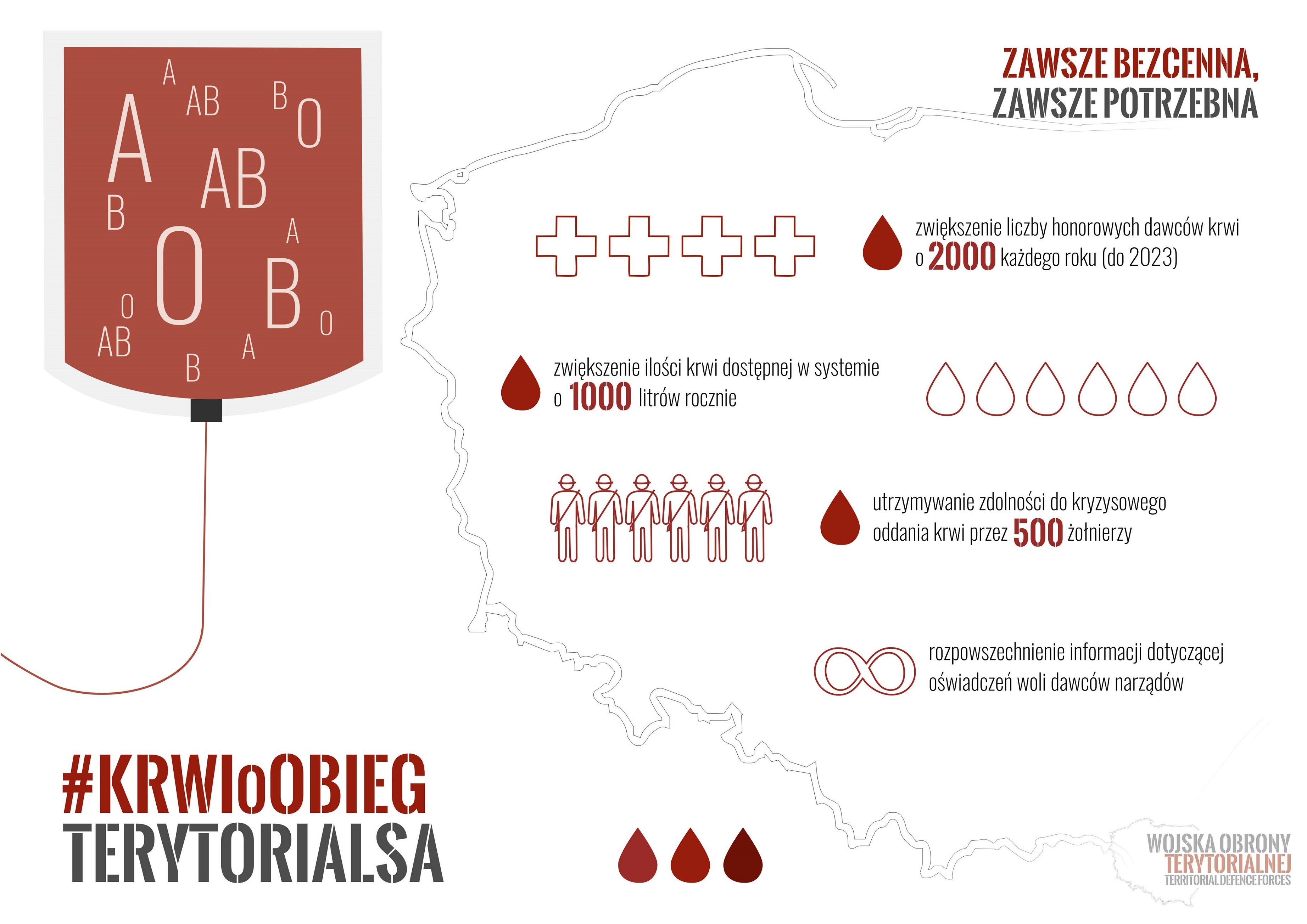 Wojska Obrony Terytorialnej rozpoczynają realizację projektu, którego celem będzie ratowanie życia i zdrowia. „KRWIOoBIEG TERYTORIALSA” to akcja, która spowoduje, że każdego roku w systemie przybędzie tysiąc litrów krwi, a w gotowości do jej alarmowego oddania będzie pół tysiąca dawców – żołnierzy.