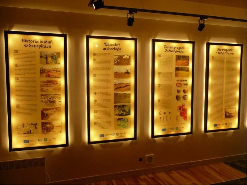 - tablice szklane podświetlane z historią m.in. badań archeologicznych w Szurpiłach, historią Jaćwieży; - mapa szklana podświetlana z podziałem plemiennym Prus w XIII w. - dwa dekoracyjne słupki ze szkła fusingowego, podświetlane z odciskami z wykopalisk archeologicznych.