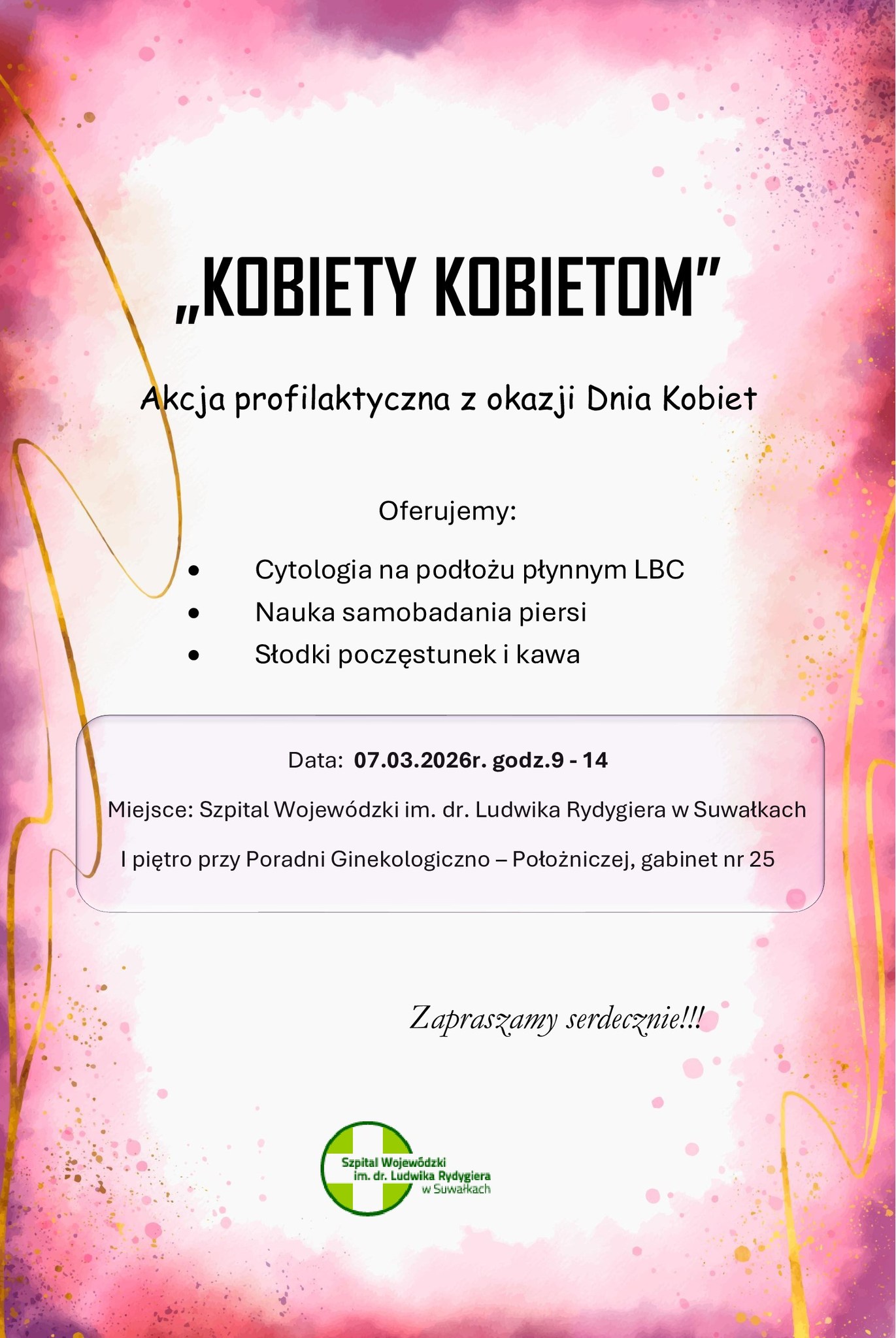 W najbliższa sobotę, 7 marca w godz. 9:00 – 14:00 przy Poradni Ginekologiczno-Połozniczej (gabinet 25 ) na I piętrze Szpitala Wojewódzkiego w Suwałkach trwać będzie akcja „Kobiety Kobietom”.