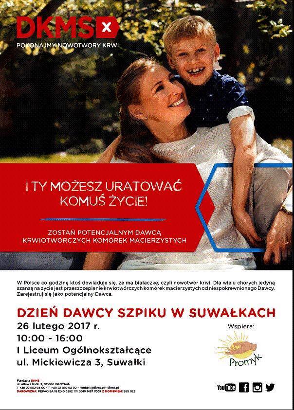 Suwalska Fundacja Promyk zaprasza na Dzień Dawcy, który odbędzie się w niedzielę, 26 lutego, w godz. od 10.00 do 16.00 w budynku I Liceum Ogólnokształcącego przy ul. Mickiewicza 3 w Suwałkach.