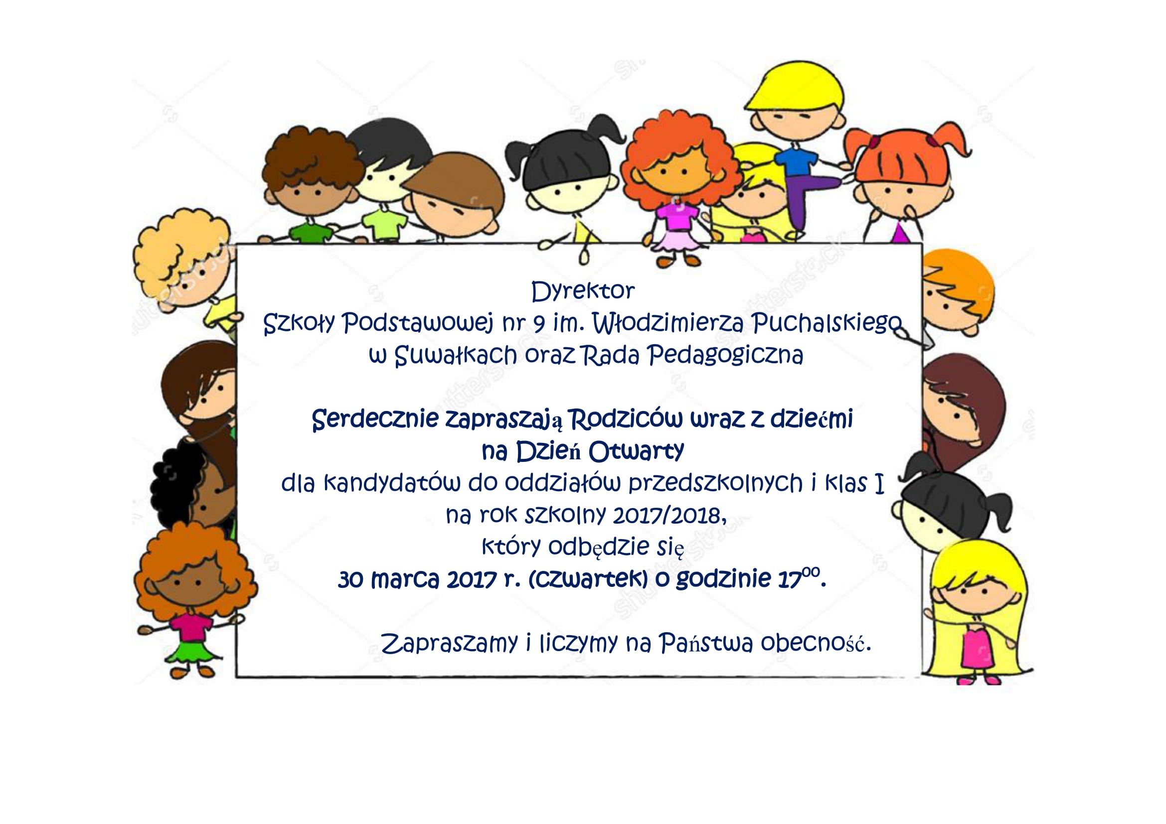 Wioletta Winckiewicz, dyrektor Szkoły Podstawowej im. Wł. Puchalskiego w Suwałkach oraz Rada Pedagogiczna zapraszają rodziców wraz z dziećmi na Dzień Otwarty dla kandydatów do oddziałów przedszkolnych i klas pierwszych na rok szkolny 2017/2018.