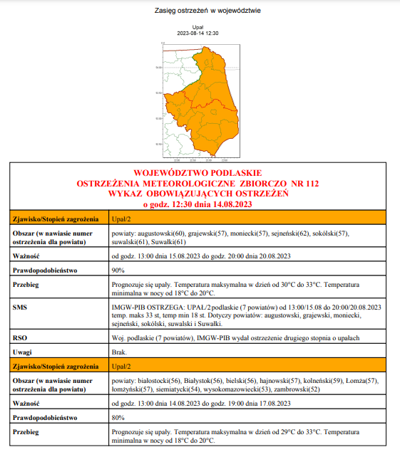 We wtorek, 15 sierpnia od godz. 13:00 aż do niedzieli 20 sierpnia do godz. 20:00 w całym regionie będzie obowiązywać ostrzeżenie II stopnia o upałach.