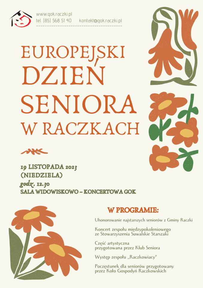 Obchody Europejskiego Dnia Seniora w Gminnym Ośrodku Kultury w Raczkach odbędą się w niedzielę,19 listopada, w sali widowiskowo - koncertowej Gminnego Ośrodka Kultury. Początek o 12.30.