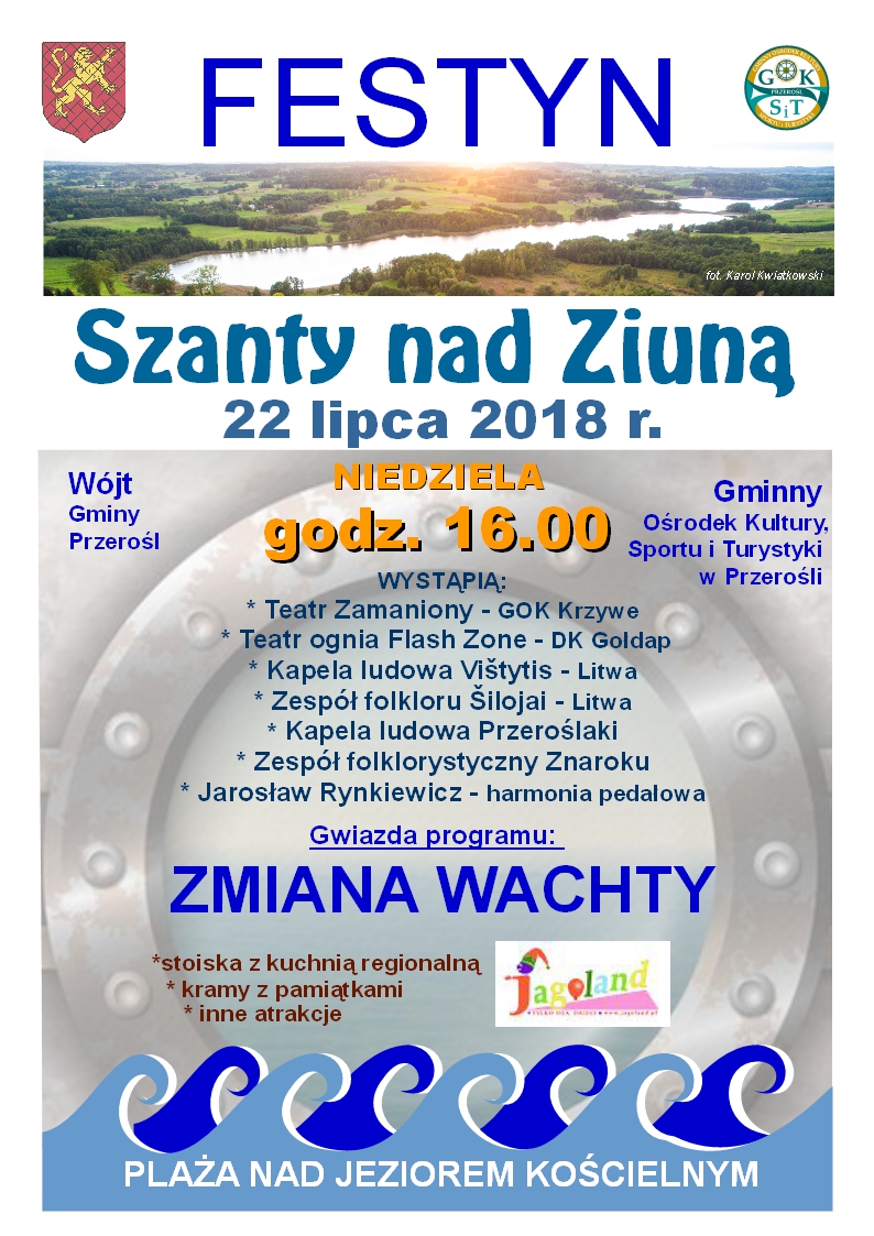 Wójt Gminy Przerośl oraz Gminny Ośrodek Kultury, Sportu i Turystyki w Przerośli zaprasza na Festyn "Szanty nad Ziuną", który odbędzie się w niedzielę na plaży nad jeziorem Kościelnym.
