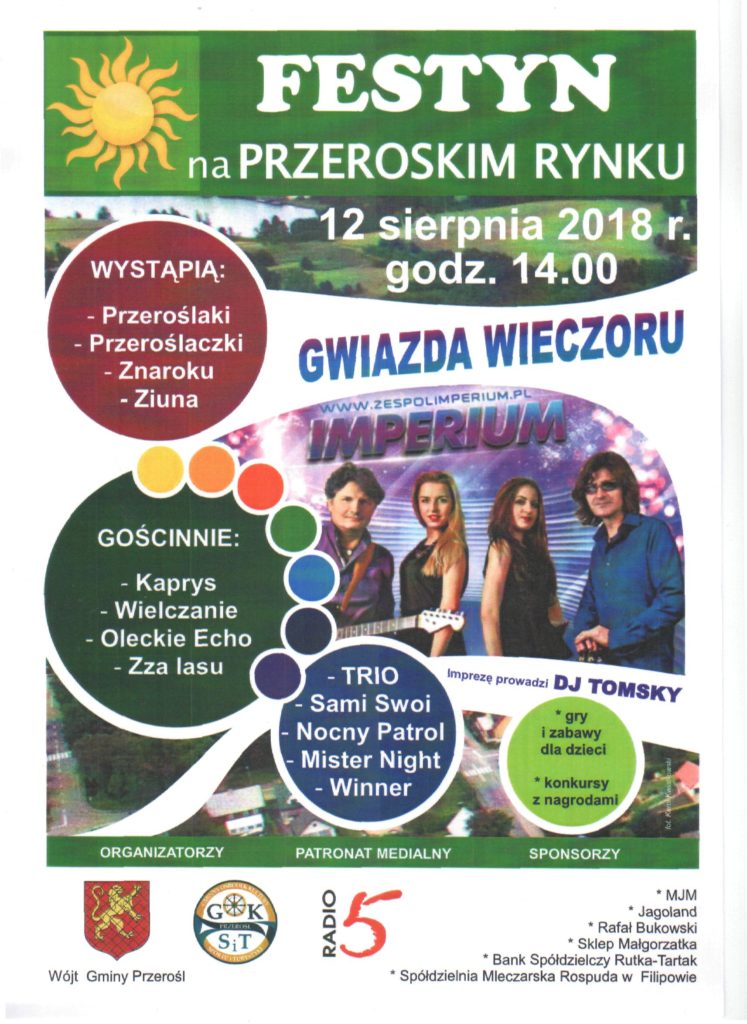 Sławomir Renkiewicz, wójt Gminy Przerośl i Gminny Ośrodek Kultury, Sportu i Turystyki w Przerośli zapraszają na Festyn „Na Przeroskim Rynku”, który odbędzie się w niedzielę, 12 sierpnia. Początek o 14.00.