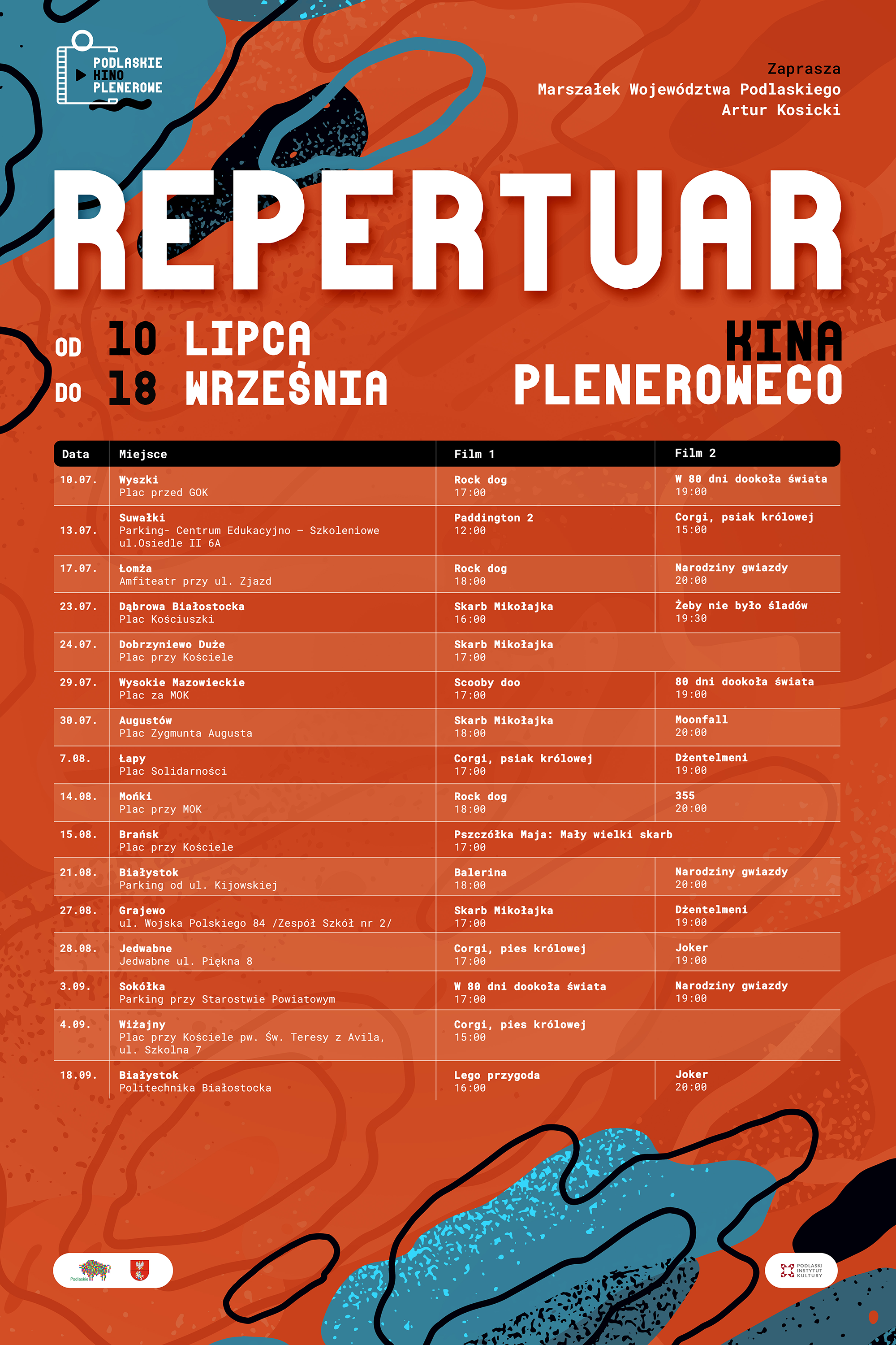 Projekcje w ramach bezpłatnego kina plenerowego odbędą się kolejno w: Wyszkach, Suwałkach, Łomży, Dąbrowie Białostockiej, Dobrzyniewie Dużym, Wysokiem Mazowieckiem, Augustowie, Łapach, Mońkach, Brańsku, Białymstoku, Grajewie, Jedwabnem, Sokółce oraz Wiżajnach. Objazd zakończy ponowna projekcja w stolicy województwa.