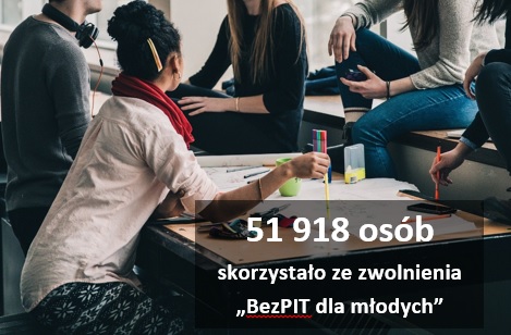 W rozliczeniach za 2019 rok po raz pierwszy pojawiło się zwolnienie „Bez PIT dla młodych”. Skorzystało z niego 51 918 młodych podatników którzy nie ukończyli 26. roku życia i osiągali przychody z pracy (czyli ze stosunku pracy, spółdzielczego stosunku pracy, stosunku służbowego lub stosunku pracy nakładczej) oraz z umów zlecenia zawartych z firmą. Łączna kwota przychodu „młodych” podatników objęta w 2019 roku tym zwolnieniem to ponad 483 mln zł, w tym 366,7 mln zł to przychody z umów o pracę, a 116,5 mln zł to przychody z umów zleceń. Oznacza to, że od takiej kwoty osoby objęte zwolnieniem „Bez PIT dla młodych” nie zapłaciły podatku PIT.
