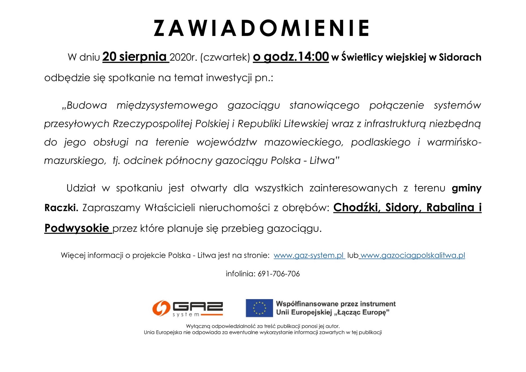 - o 14.00 w Świetlicy w wiejskiej w Sidorach. Tutaj powinni przyjść zainteresowani inwestycję mieszkańcy ze wsi Chodźki, Sidory, Rabaliny i Podwysockie, przez które to będzie przebiegał gazociąg.