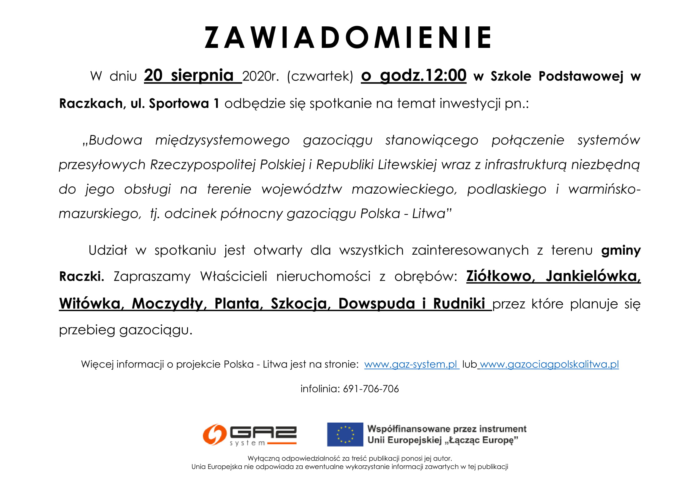 GAZ –SYSTEM organizuje kolejne spotkania w sprawie budowy polsko - litewskiego gazociągu. Tym razem przeprowadzone zostaną na terenie gminy Raczki.