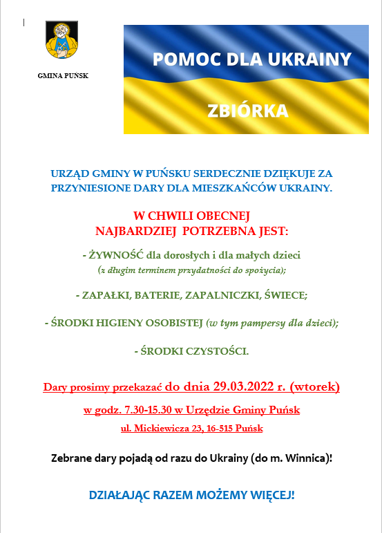 Urząd Gminy w Puńsku serdecznie dziękuje mieszkańcom gminy za dotychczas zebrane dary dla uciekinierów z Ukrainy i prosi o kolejne. Tym razem zebrane dary pojadą bezpośrednio do Winnicy na Ukrainie.