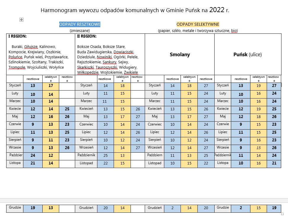 Urząd Gminy w Puńsku ustalił następujący grafik odbioru od mieszkańców odpadów komunalnych w 2022 roku.