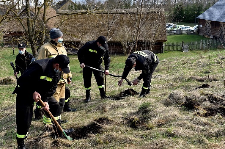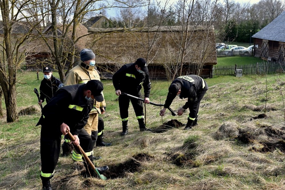 Brzozy, bo takie drzewa wybrano, posadzono przy skansenie. W akcji brali druhowie z OSP w Puńsku i Smolanach.