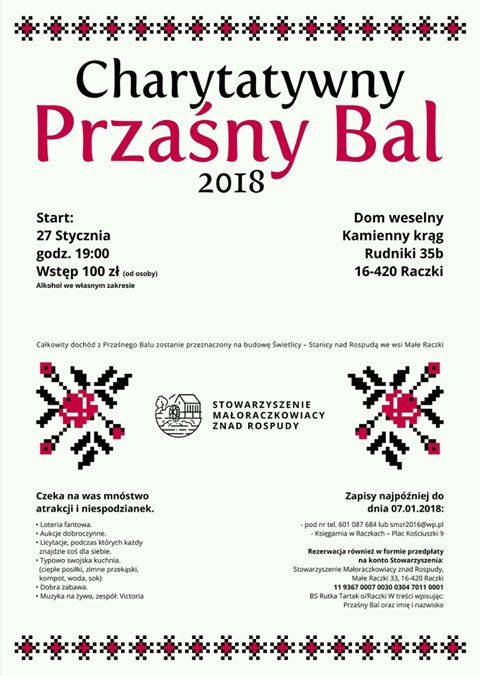 Stowarzyszenie Małoraczkowiacy Znad Rospudy zaprasza na Charytatywny Przaśny Bal. Bal odbędzie się 27 stycznia w Domu Weselnym „Kamienny Krąg”. Dochód z balu zostanie przeznaczony na budowę świetlicy w Małych Raczkach.