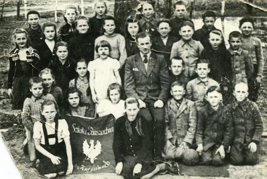 Uczniowie szkoły w Kuriankach z nauczycielem. Trzymają sztandar ukrywany w czasie wojny. Fot. RA