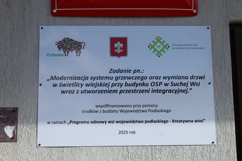 Wójt Gminy Raczki informuje, że zakończono realizację zadania pod nazwą: „Modernizacja systemu grzewczego oraz wymiana drzwi w świetlicy wiejskiej przy budynku OSP w Suchej Wsi wraz z utworzeniem przestrzeni integracyjnej”.