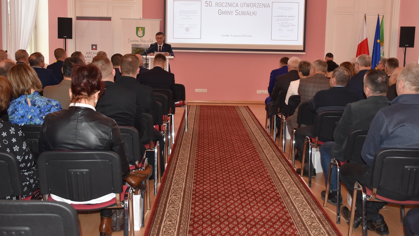 W sali Archiwum Państwowego na uroczystej sesji zebrali się radni, władze i pracownicy Gminy Suwałki oraz ich goście.