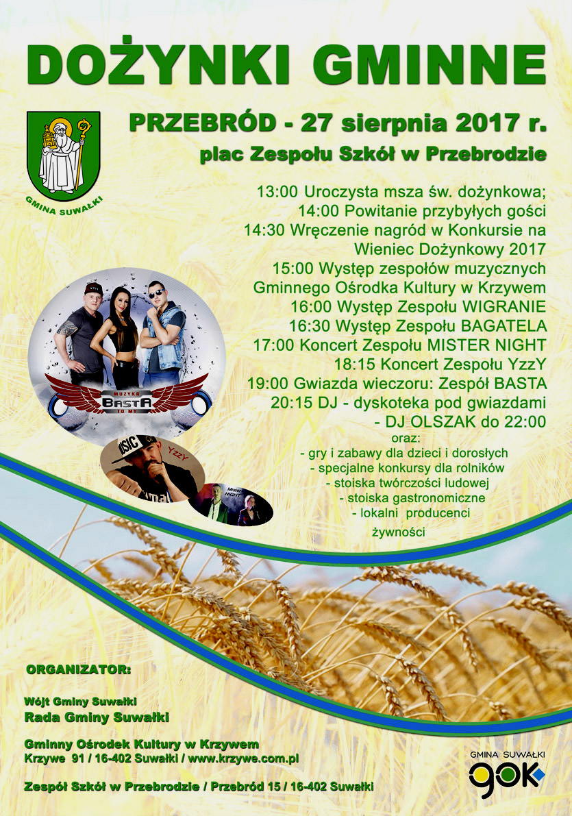 - Nie był to niestety najlepszy rok dla rolników, przymrozki, susza to sprawiło, że plony będą niższe niż przed rokiem. W gminie żniwa jeszcze trwają, ale wzorem lat ubiegłych w ostatnią niedzielę sierpnia organizujemy Gminne Święto Plonów. Chcemy w ten sposób podziękować rolnikom za ich trud, za każdy zebrany kłos zboża, za mąkę z której będziemy jedli chleb i życzyć nie tylko mieszkańcom gminy, ale wszystkim Polakom aby „chleba naszego powszedniego” starczyło dla wszystkich aż do zbiorów w roku 2018 – mówi Tadeusz Chołko, wójt gminy Suwałki, który z rąk starostów (nazwisko starosty znane będzie w piątek, 25.08.) odbierze bochen chleba upieczonego z mąki z tegorocznych zbiorów i podzieli się nim z uczestnikami dożynek.