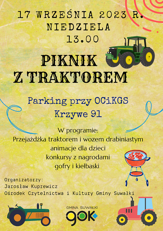 Ośrodek Czytelnictwa i Kultury Gminy Suwałki serdecznie zaprasza na Potańcówkę pod malowanym muralem i Piknik z traktorem.