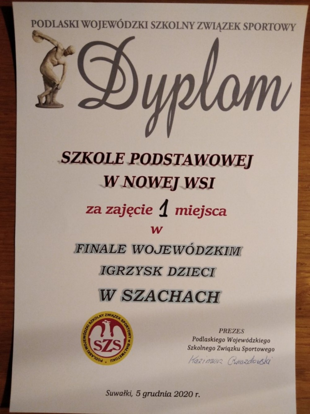 Szkołę reprezentowali: Hania Butkiewicz, Kacper Boguszewski, Janek Butkiewicz oraz Dorian Sawicki, a także JarosÅ‚aw OÅ‚ów - instruktor szachowy. Uzyskany wynik daje ekipie z Nowej Wsi prawo startu w Ogólnopolskich Igrzyskach Dzieci, które zazwyczaj odbywajÄ… siÄ™ w maju.