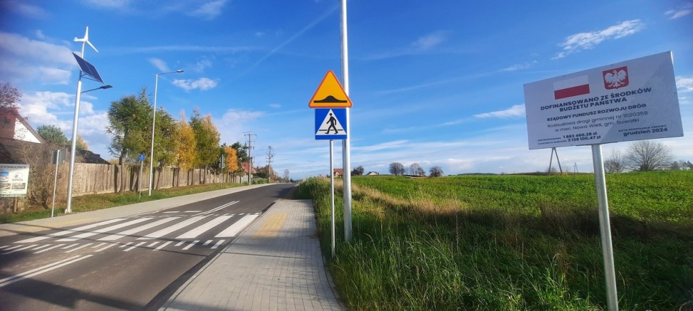 W Gminie Suwałki zakończono rozbudowę drogi gminnej nr 102035B w miejscowości Nowa Wieś. W ramach inwestycji na odcinku o długości 1.03 km wykonano nową nawierzchnię jezdni z nawierzchni bitumicznej o szerokości 5,50 m, ciąg pieszo - rowerowy jednostronny o szerokości 2,50 m z kostki brukowej oraz dwa wyniesione przejścia dla pieszych.