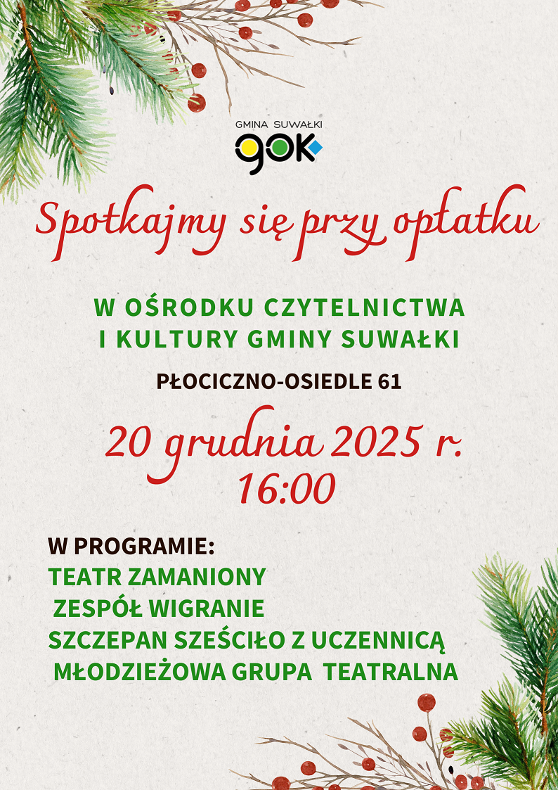 UrzÄ…d Gminy w SuwaÅ‚kach oraz OÅ›rodek Kultury zapraszajÄ… wszystkich mieszkaÅ„ców Gminy SuwaÅ‚ki na spotkanie opÅ‚atkowe w OÅ›rodku Czytelnictwa i Kultury Gminy SuwaÅ‚ki w PÅ‚ocicznie-Osiedle.