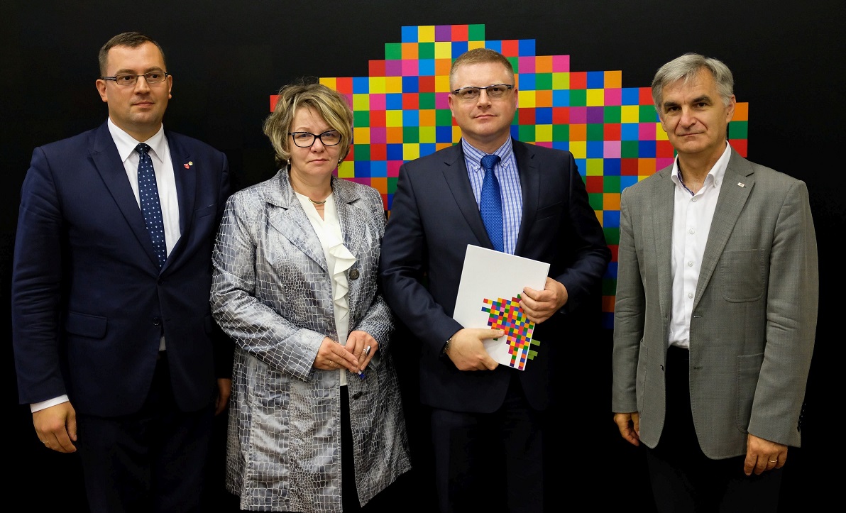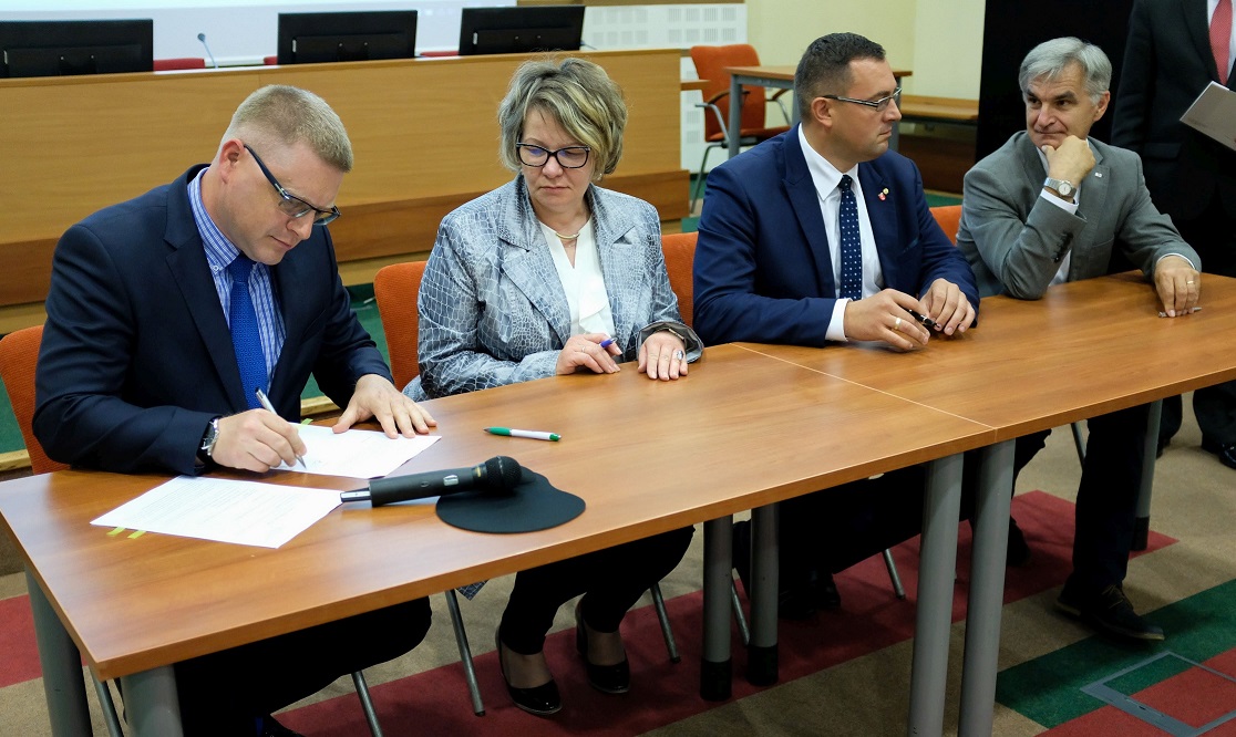 Wójt Gminy Szypliszki Mariusz Grygieńć, Skarbnik Gminy Małgorzata Barszczewska oraz Bogdan Dyjuk i Stefan Krajewski , członkowie Zarządu Województwa Podlaskiego podpisali umowę o dofinansowaniu realizacji projektu „Zakup wyposażenia sportowego i rekreacyjnego do ogólnodostępnej sali gimnastycznej w Kaletniku” w ramach „Programu odnowy wsi województwa podlaskiego”.