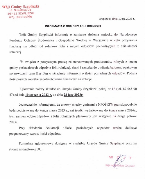 Urząd Gminy w Szypliszkach będzie ubiegał się w Narodowym Funduszu Ochrony Środowiska i Gospodarki Wodnej o fundusze na bezpłatny odbiór od rolników folii rolniczej i innych odpadów pochodzących z działalności rolniczej, np. sznurka do owijania balotów, opakowań po nawozach, itp.).