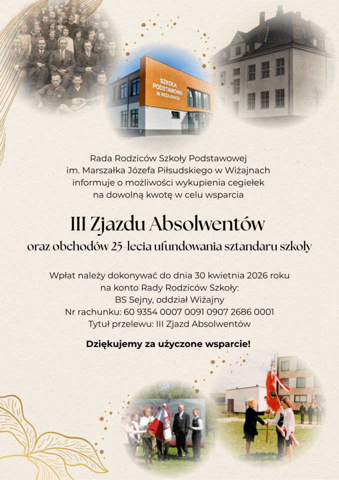 Rada Rodziców Szkoły Podstawowej im. Marszałka Józefa Piłsudskiego w Wiżajnach informuje o możliwości wykupienia cegiełek na dowolną kwotę w celu wsparcia Obchodów 25- lecia ufundowania szkole sztandaru oraz III Zjazdu Absolwentów.