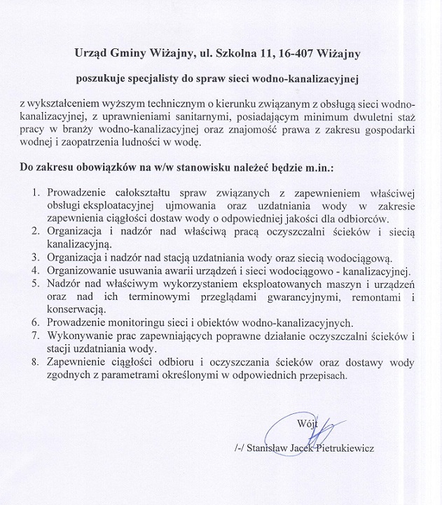 Urząd Gminy Wiżajny poszukuje specjalisty do spraw sieci wodno-kanalizacyjnej. Kandydat powinien posiadać wyższe wykształcenie techniczne oraz minimum dwuletni staż pracy w branży wodno-kanalizacyjnej.