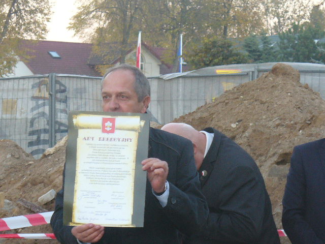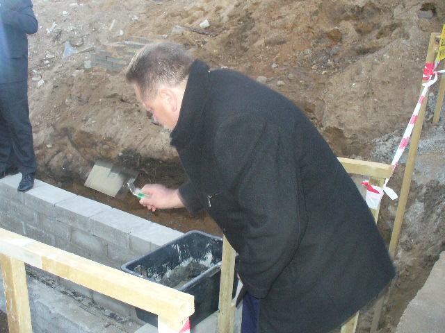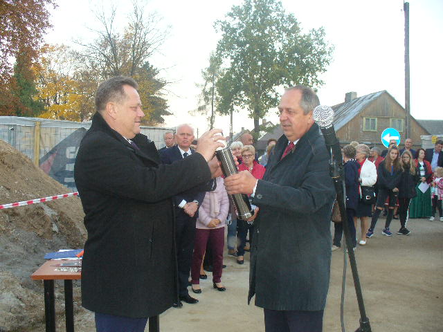 Wiceminister Spraw Wewnętrznych i Administracji Jarosław Zieliński wraz z małżonką i Romualdem Łanczkowskim, kandydatem do Rady Sejmiku Wojewódzkiego dokonali w sobotę symbolicznego wmurowania aktu erekcyjnego w fundamenty rozbudowywanej remizy Ochotniczej Straży Pożarnej w Raczkach.