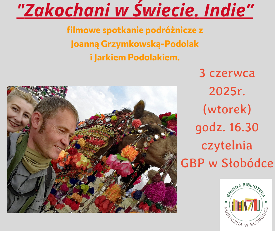 Gminna Biblioteka Publiczna w Słobódce zaprasza w najbliższy wtorek, 3 czerwca o godz. 16:30 na "Zakochani w Świecie. Indie” - filmowe spotkanie podróżnicze z Joanną Grzymkowską-Podolak i Jarkiem Podolakiem.