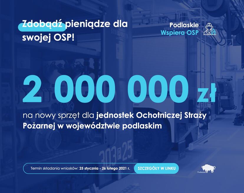 Do rozdysponowania opisane cele przeznaczono Å›rodki w wysokoÅ›ci 2 000 000 zÅ‚. Organizatorem konkursu jest SamorzÄ…d Województwa Podlaskiego.