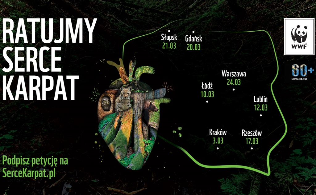 Dodatkowo, od kilku lat w Polsce ,,Godzina dla Ziemi” służy rozwiązywaniu konkretnych problemów ekologicznych. W tym roku odbędzie się ona pod hasłem „Ratujmy serce Karpat” i dotyczyć będzie ochrony Puszczy Karpackiej. To jedyne miejsce w Polsce, gdzie żyją wszystkie nasze duże drapieżniki – niedźwiedź, wilk i ryś oraz bardzo rzadkie w skali Europy ptaki, jak orzeł przedni, puszczyk uralski i sóweczka. ,,Godzina dla Ziemi” ma pokazać, że opowiadamy się za tym, aby najcenniejsze fragmenty Puszczy Karpackiej, jako nasze dziedzictwo narodowe, zachować dla przyszłych pokoleń.