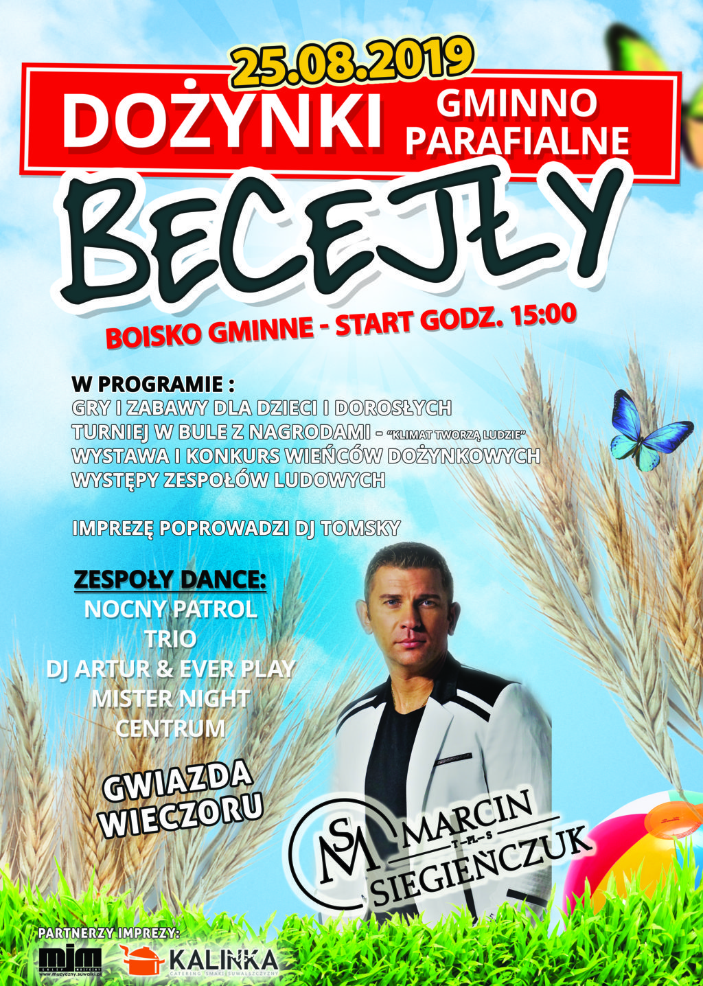 Natomiast w niedzielÄ™ odbÄ™dÄ… siÄ™ dożynki gminne w BecejÅ‚ach. BÄ™dzie tradycyjny konkurs wieÅ„ców, konkursy i zabawy dla najmÅ‚odszych oraz wystÄ™py muzyczne. GwiazdÄ… wieczoru bÄ™dzie MarciÅ„ SiegieÅ„czuk z zespoÅ‚u Toples.