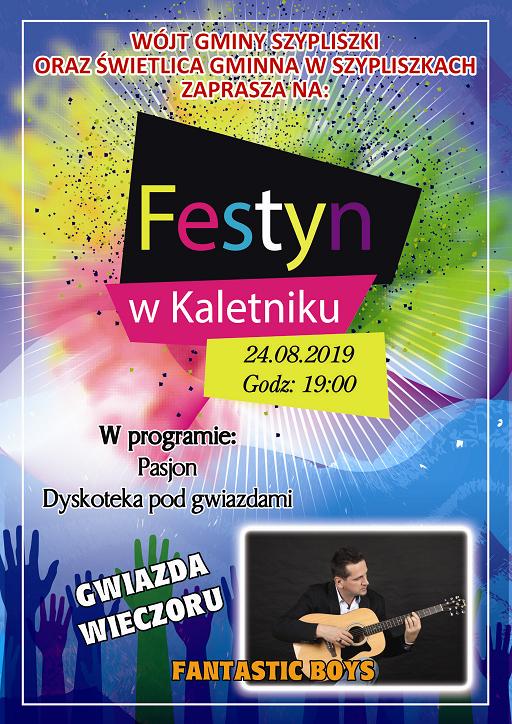 Wójt Gminy Szypliszki oraz Åšwietlica Gminna w Szypliszkach zapraszajÄ… na festyn w Kaletniku w sobotÄ™, 24 sierpnia. PoczÄ…tek imprezy o 19.00. W programie wystÄ™p zespoÅ‚u Pasjon oraz dyskoteka pod gwiazdami. ScenicznÄ… gwiazdÄ… wieczoru bÄ™dzie Fantastic Boys. WstÄ™p wolny.