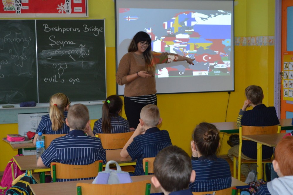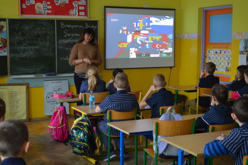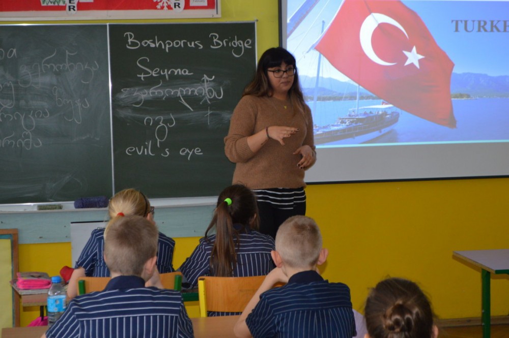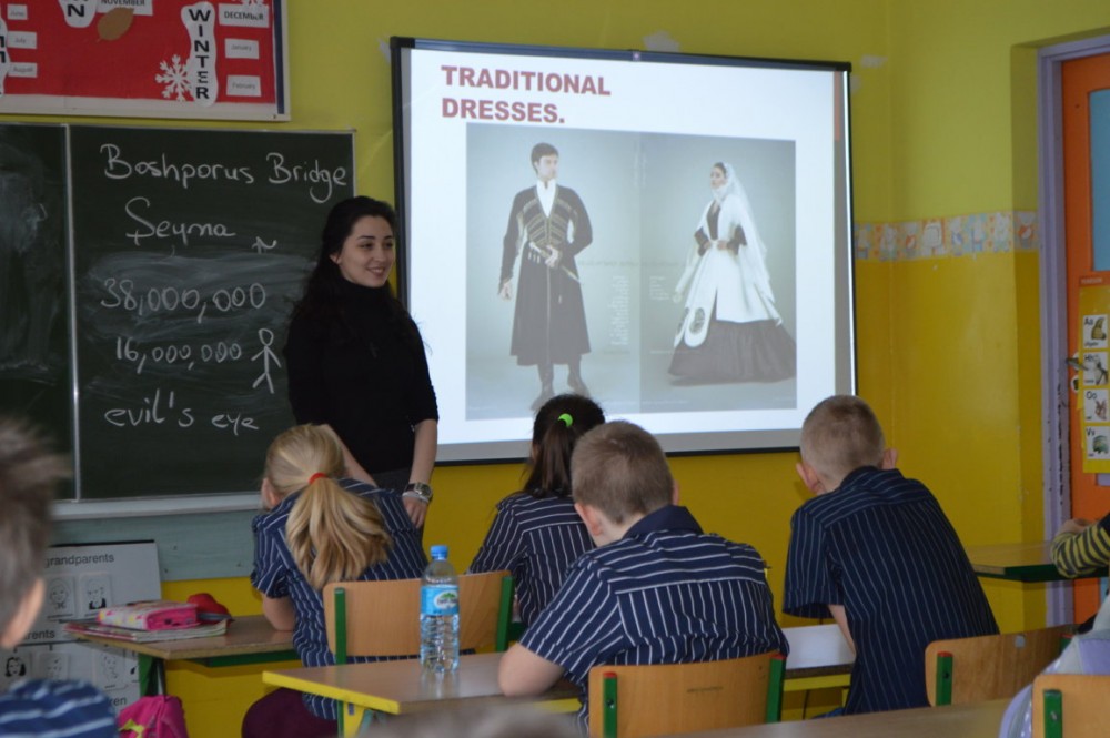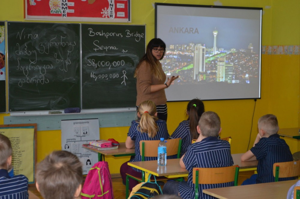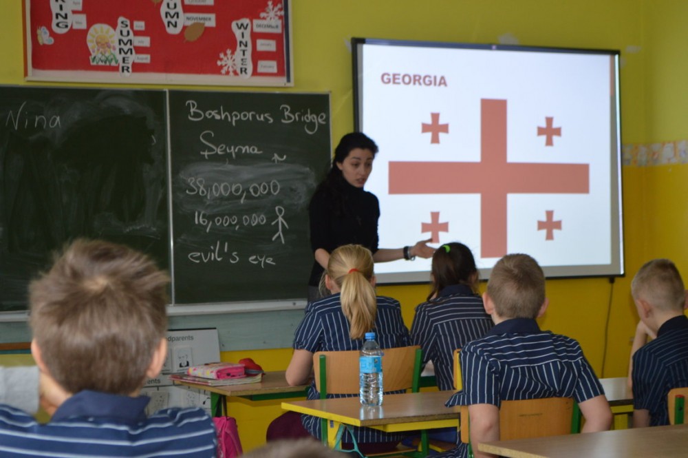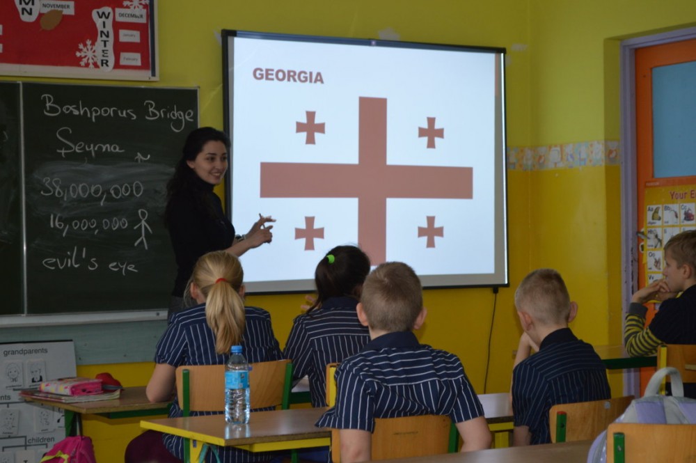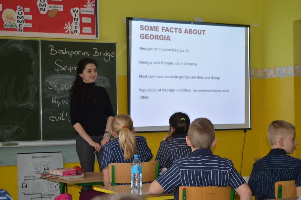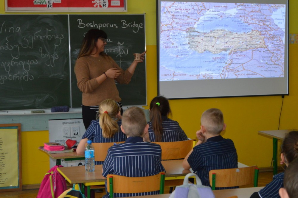 Nina Chijavadze opowiadaÅ‚a z kolei o najpiÄ™kniejszych zakÄ…tkach niedużej Gruzji, o ciepÅ‚ych wodach Tbilisi, niespodziewanych opadach Å›niegu, micie opowiadajÄ…cym o powstaniu kraju. Dzieci dowiedziaÅ‚y siÄ™ również, że gruziÅ„ski alfabet jest jednym z najstarszych na Å›wiecie. Wszystkim chÄ™tnym studentka pisaÅ‚a ich imiona po gruziÅ„sku.