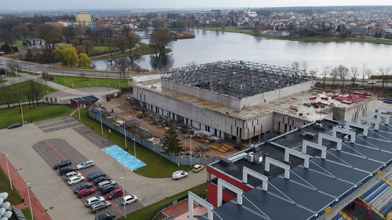 DÅ‚ugi na 100, szeroki na 60 i wysoki na 12 metrów obiekt, przylegajÄ…cy do campingu i piÅ‚karskiego stadionu oraz sasiadujÄ…cy z zalewem Arkadia juz robi wrażenie. Widać to na zdjÄ™ciach lotniczych, wykonanych przez Straż MiejskÄ… oraz "lÄ…dowych", autorstwa Grzegorza Krysy, zastÄ™pcy dyrektora OSiR-u. W tym tygodniu, jeżeli pogoda pozwoli, kÅ‚adziony ma być dach.