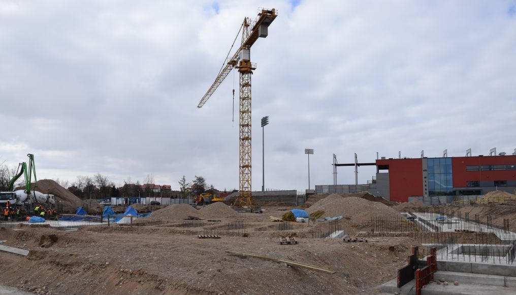 Na budowie widać już nie tylko olbrzymi dźwig oraz ławy fundamentowe, ale i wystąjące z nich pręty zbrojeniowe. Budowa obiektu Suwałki Arena trwa już 3,5 miesiąca, o postępach prac ratusz melduje niemal co tydzień.