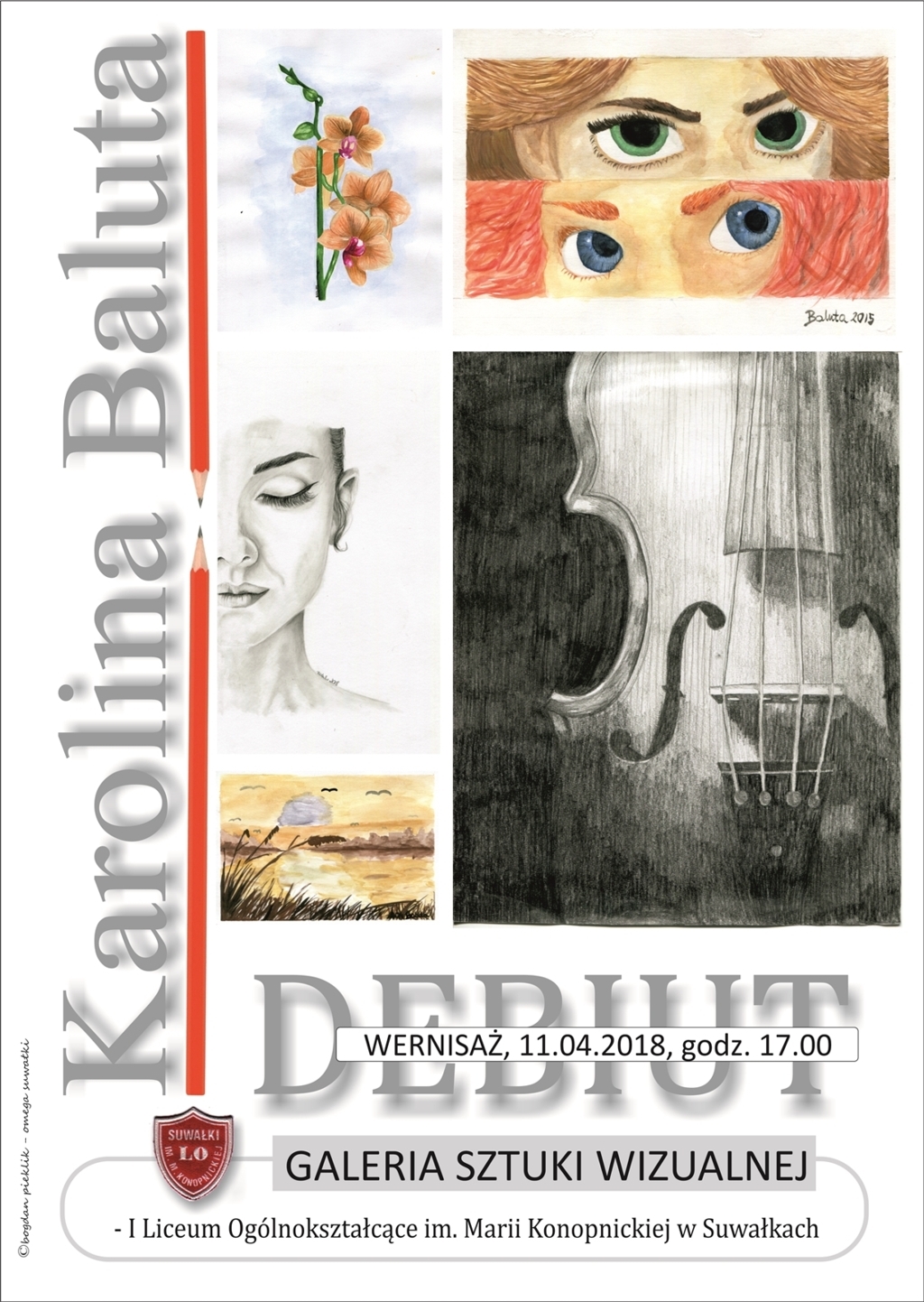 W środę, 11 kwietnia, o godz. 17.00 odbędzie się wernisaż prac Karoliny Baluty. Karolina Baluta ma 18 lat. Pochodzi z Sejn, uczy się w I Liceum Ogólnokształcącym im. Marii Konopnickiej w Suwałkach.