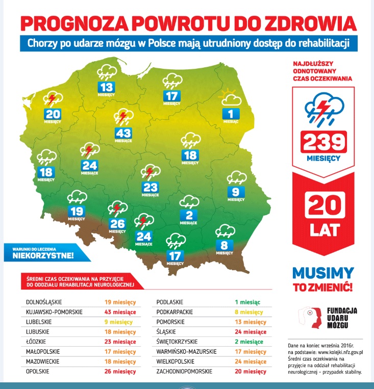Opublikowane badania pokazujÄ…, że problem z dostÄ™pnoÅ›ciÄ… do rehabilitacji wtórnej jest ogromny. (Rehabilitacja wtórna jest kontynuacjÄ…, rehabilitacji jakiej pacjent poddawany jest bezpoÅ›rednio po przebytym udarze, jeszcze na oddziale neurologicznym.) Najgorzej sytuacja przedstawia siÄ™ w województwach Å›lÄ…skim, opolskim, wielkopolskim, Å‚ódzkim i zachodniopomorskim. W tych regionach chorzy czekajÄ… Å›rednio od 20 do 43 miesiÄ™cy.