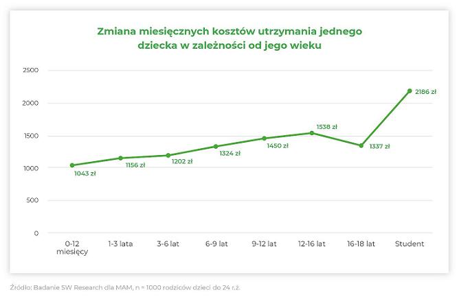 Najnowszy raport platformy MAM „Ile kosztuje dziecko w Polsce?” prezentuje koszty związane z posiadaniem potomstwa. Koszt wychowania jednego dziecka przez pierwsze 18 lat jego życia to kwota ponad 305 000 zł. W wypadku pozostawania dziecka na utrzymaniu rodziców również w okresie studiów muszą oni liczyć się z kolejnym wydatkiem, ponad 130 000 zł (średnio 2186 zł miesięcznie).