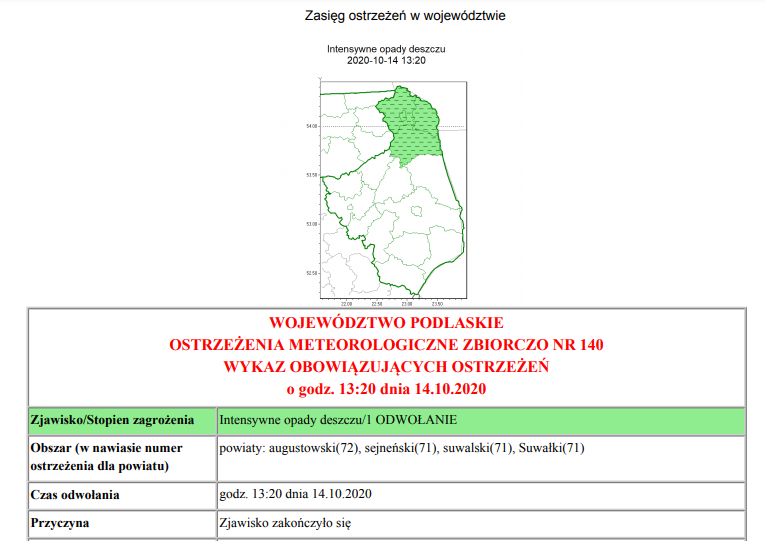 Długo czekaliśmy na deszcz, ale co za dużo… Na szczęście, białostockie Biuro Prognoz Meteorologicznych IMGW – PIB odwołało ostrzeżenie o intensywnych opadach na Suwalszczyźnie.