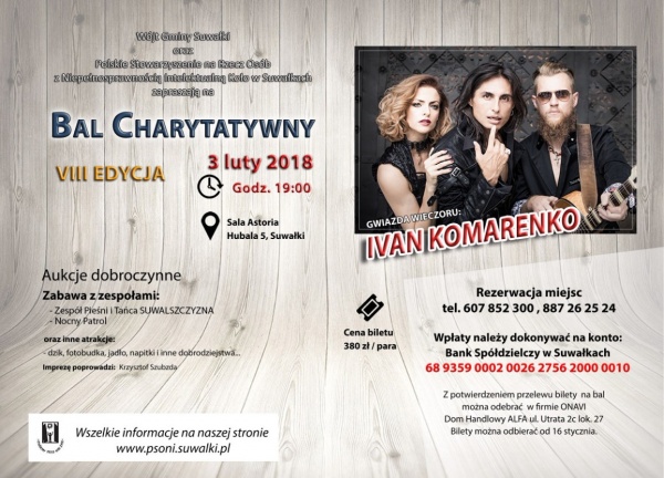 Gmina Suwałki oraz Polskie Stowarzyszenie na Rzecz Osób z Niepełnosprawnością Intelektualną Koło w Suwałkach zapraszają na VIII edycję Balu Charytatywnego, z którego dochód zostanie przeznaczony na rozbudowę ośrodka w Brodzie Nowym. Wystąpią Zespół Pieśni i Tańca Suwalszczyzna, Nocny Patrol, a gwiazdą wieczoru będzie znany z przeboju „Czarne oczy” Ivan Komarenko.