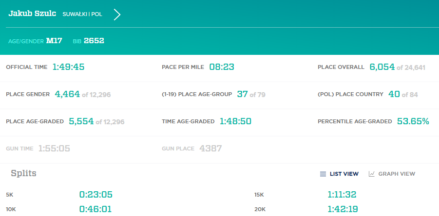 Jakub Szulc uzyskał czas 1:49:45. W klasyfikacji generalnej zajął 6.054 miejsce, a w swojej grupie wiekowej uplasował się na 37. pozycji.