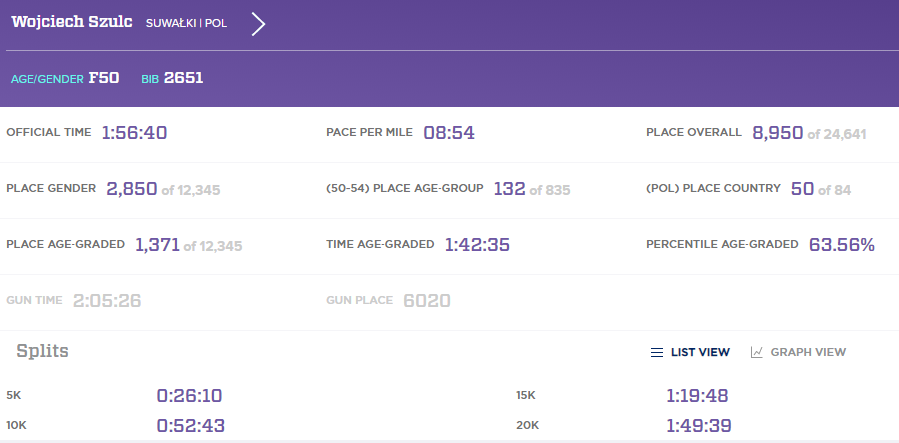 Wojciech Szulc dotarÅ‚ na metÄ™ niemal 7 minut za synem – 1:56:40. W swojej kategorii zajÄ…Å‚ 132. miejsce wÅ›ród 835 rówieÅ›ników.