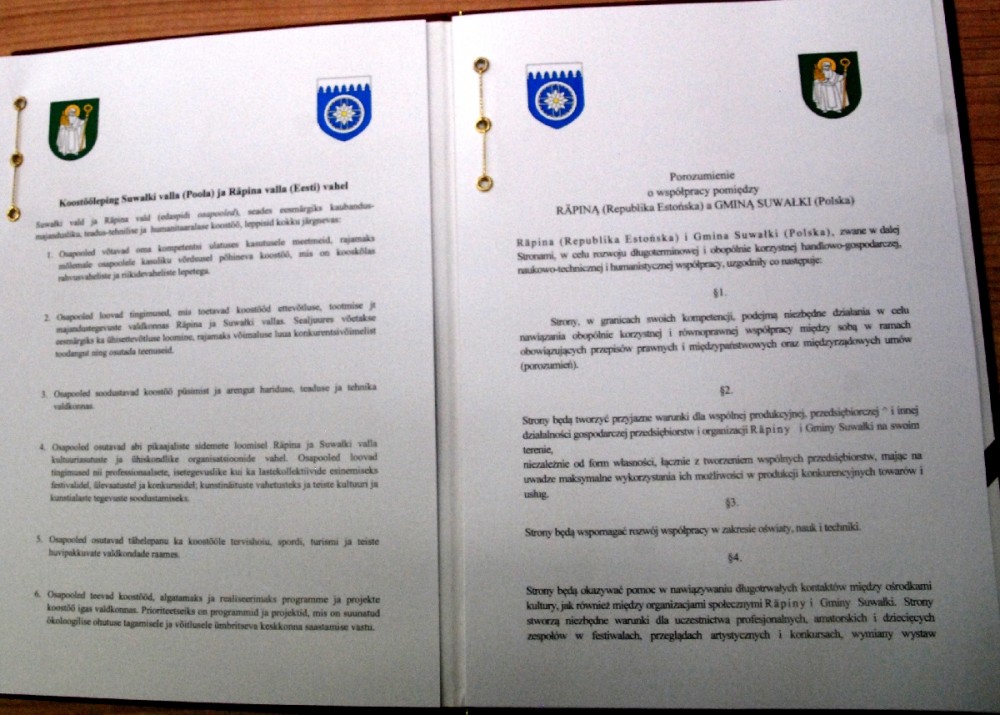 - Z samorządem Räpiny ustaliliśmy, że nasza współpraca, oparta na obowiązujących przepisach prawnych oraz umowach międzypaństwowych, pozwoli na stworzenie warunków dla wspólnej działalności gospodarczej, łącznie z tworzeniem wspólnych przedsiębiorstw – o umowie mówi Tadeusz Chołko, wójt gminy Suwałki. – Będziemy także wspierać rozwój współpracy w zakresie oświaty, nauki, techniki, pomagać w nawiązaniu kontaktów pomiędzy ośrodkami kultury, organizacjami społecznymi, stwarzać warunki do udziału zespołów artystycznych, w tym amatorskich zespołów dziecięcych i młodzieżowych, w festiwalach, przeglądach i konkursach. Umowa przewiduje także współpracę w zakresie kultury, sztuki, ochrony zdrowia, sportu i turystyki.