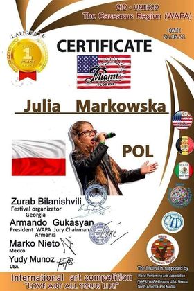 Julia Markowska jest laureatkÄ™ wielu wokalnych konkursów, zarówno w Polsce jak i za granicÄ…., m.in. o Super Mikrofon Radia JARD, MiÄ™dzynarodowego Festiwalu Piosenki i TaÅ„ca "Muszelki Wigier".